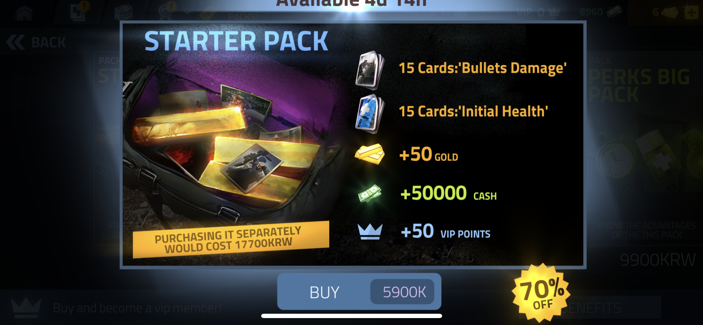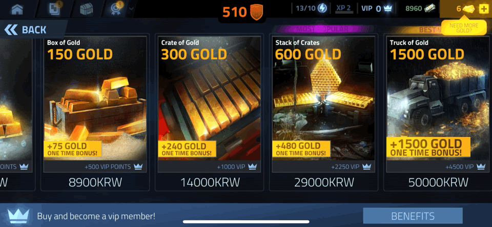 상점 하단의 고정 영역을 활용하여 VIP 상품으로 강하게 유도하고 있다. 화면 하단의 고정 영역은 스크롤의 영향을 받지 않아 더 많은 노출 효과를 가지며, 손가락이 접근하기에도 편리한 위치이기 때문에, 핵심 BM 요소를 광고하기에 좋은 자리이다.