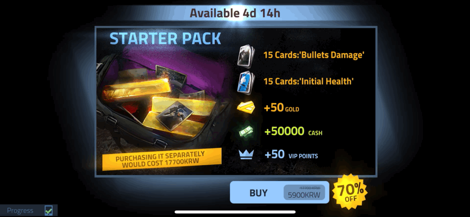 처음에는 구매 버튼만 보여주다가, 1~2초가 지난 후에야 닫기 버튼을 슬그머니 노출한다. 잠깐의 시간 동안 사용자는 상품의 구성과 가격 탐색에 더욱 집중할 수 있다. (이 사례 외에도 Cover Fire는 정보를 순차적으로 전달하는 마이크로 인터렉션이 잘 되어있는 게임이다.)