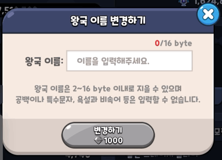 1. '이름을 입력해주세요.' 카피로 입력을 유도합니다. 이 카피는 사용자가 입력을 시작하면 사라지지만, 텍스트 필드 옆에 '왕국 이름'이란 정보를 고정적으로 두어 사용자가 무엇을 입력하는 곳인지 절대 헷갈리지 않도록 안전장치를 겹겹이 두었습니다.