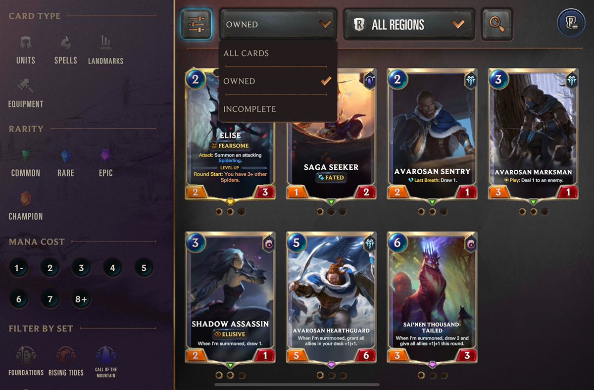 <레전드 오브 룬테라>의 카드 수집품 메뉴는 필터와 검색 기능을 제공하여, 수많은 카드 목록 속에서 사용자가 원하는 카드의 정보를 빠르게 탐색하도록 돕고 있습니다. 여기에서 눈여겨볼 점은 검색어를 입력하는 검색 창(텍스트 필드)을 바깥으로 꺼내놓지 않고 숨겨둔 것입니다.