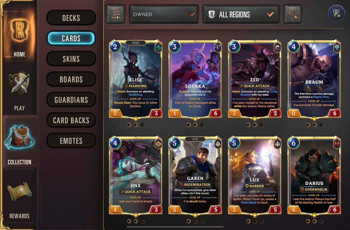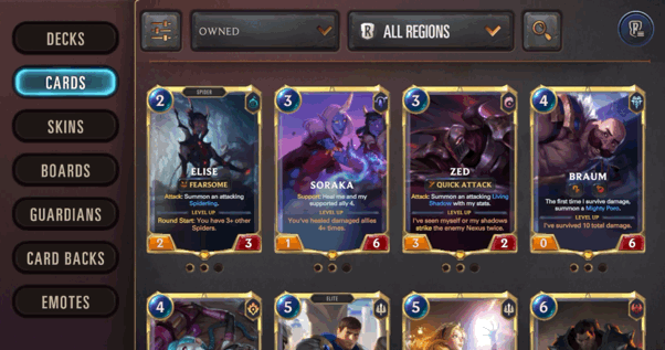 검색이 주요한 기능인 포털 서비스나, 검색을 자주 사용하는 게임 속 친구 추가와 같은 컨텐츠에서 검색창을 숨겨놓는다면 사용자가 취해야 할 행동 과정이 많아져 불편함을 야기할 것입니다. 그러나 <레전드 오브 룬테라>의 카드 수집품 메뉴에선 검색 기능의 비중이 높지 않습니다. 때문에 사용자가 일일이 타이핑을 해야 하는 불편함이 있는 검색 기능에 앞서 우선적으로 상세한 필터 기능 ui 을 제공하여, 신속하고 편리한 정보 탐색을 유도하고 있습니다.
