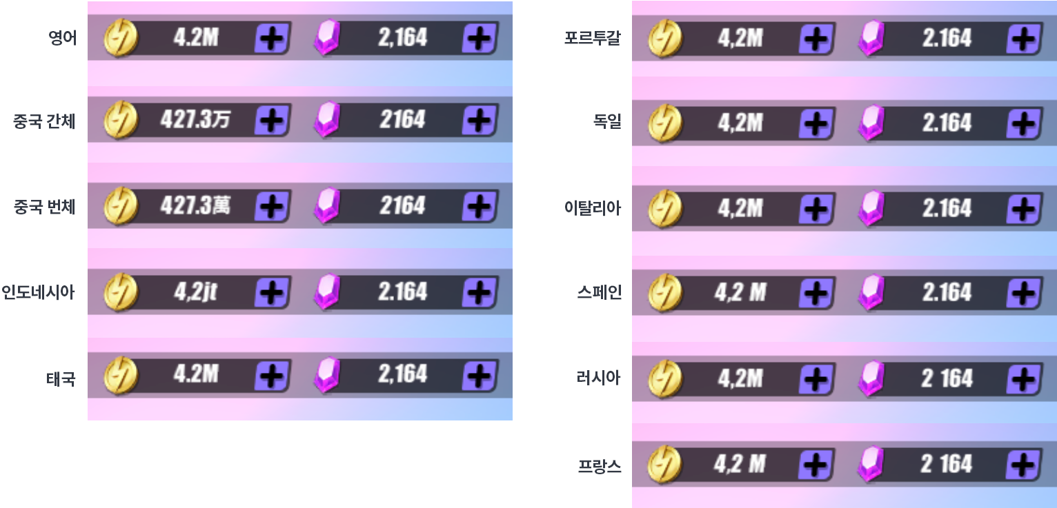 게임에서 흔히 쓰이는 'Lv', 'auto', 'new', 'all', 'equip', 'on', 'off' 과 같이 쉽고 간단해 보이는 단어라도, 누군가에게는 의미를 알 수 없는 낯선 말일 수 있습니다. 서비스에 번역하지 않은 텍스트, 특히 영단어가 그대로 들어있지는 않나요? 개발 엔진을 통해 넣은 텍스트뿐 아니라 배지, 상품 배너 등 이미지로 되어있는 글자까지 꼼꼼하게 점검해 보세요.