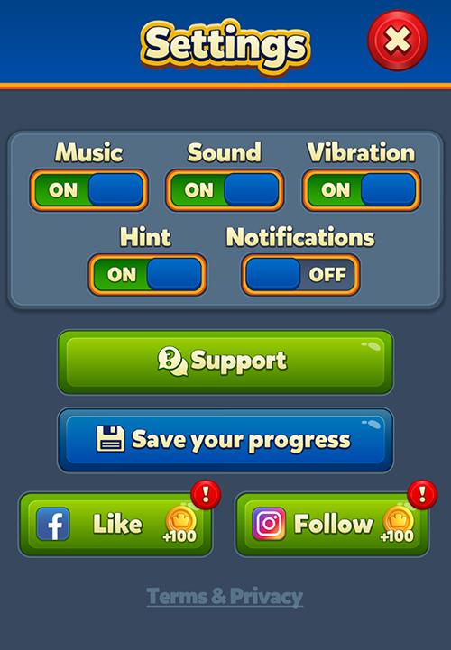 <로얄 매치>의 설정 화면입니다. 제작자는 화면 아래에 있는 페이스북과 인스타그램 버튼으로 사용자를 유도하고 싶었나 봅니다. 코인을 준다고 꼬드기고, 버튼의 오른쪽에는 빨간색 배지에 느낌표까지 넣었어요. 이 번튼들이 중요하다고, 눌러달라고 강조하고 있습니다.