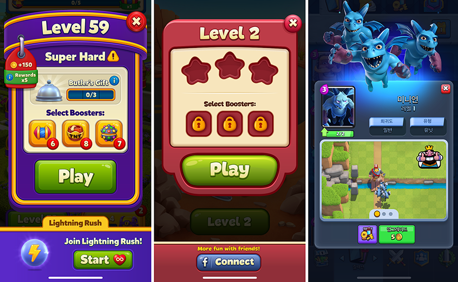 <토이 블라스트>, <툰 블라스트>, <로얄 매치>로 이어지는 캐주얼 퍼즐 게임부터 슈퍼셀의 히트작 <클래시 오브 클랜>, <클래시 로얄>, <브롤스타즈>까지 많은 게임에서 빨간색 닫기 버튼을 찾아볼 수 있는데요. 이 게임들의 영향으로 '닫기 버튼=빨간색'이 게임 UI에서 하나의 방식으로 이어지고 있습니다.