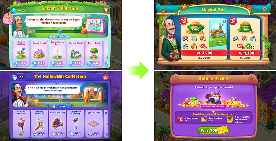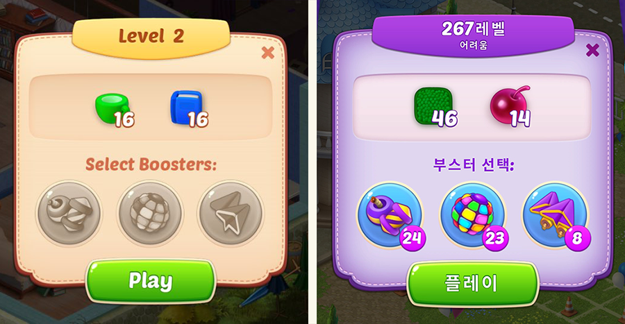개발사 Playrix는 앞서 2017년, 차기작 <꿈의 집>을 출시하면서 빨간색 닫기 버튼의 관습을 버린 전적이 있습니다. 이때에도 화면에서 닫기 버튼이 눈에 띄지 않도록, 팝업의 색에 맞추어 닫기 버튼을 변경하였습니다. 차기작에서 먼저 시도한 후, 뒤늦게 <꿈의 집>에 반영한 케이스가 되겠네요.