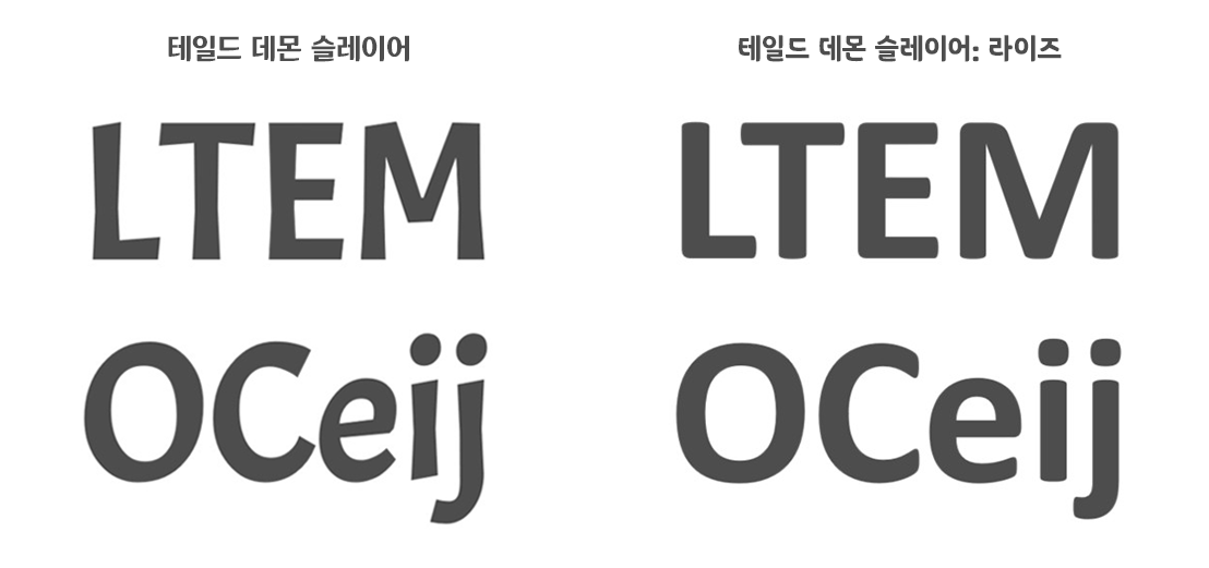또 다른 사례를 볼게요. <테일드 데몬 슬레이어: 라이즈>는 캐릭터의 대사에서 만화적인 연출과, 구어체의 맛을 살릴 수 있도록 손글씨 느낌의 이탤릭 폰트를 추가로 사용했어요.